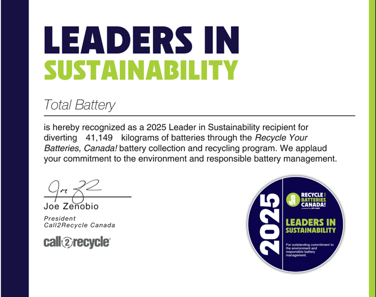 We are proud to announce that Total Battery and its Canadian team have been recognized as a 2025 Leaders in Sustainability Award recipient by Call2Recycle.